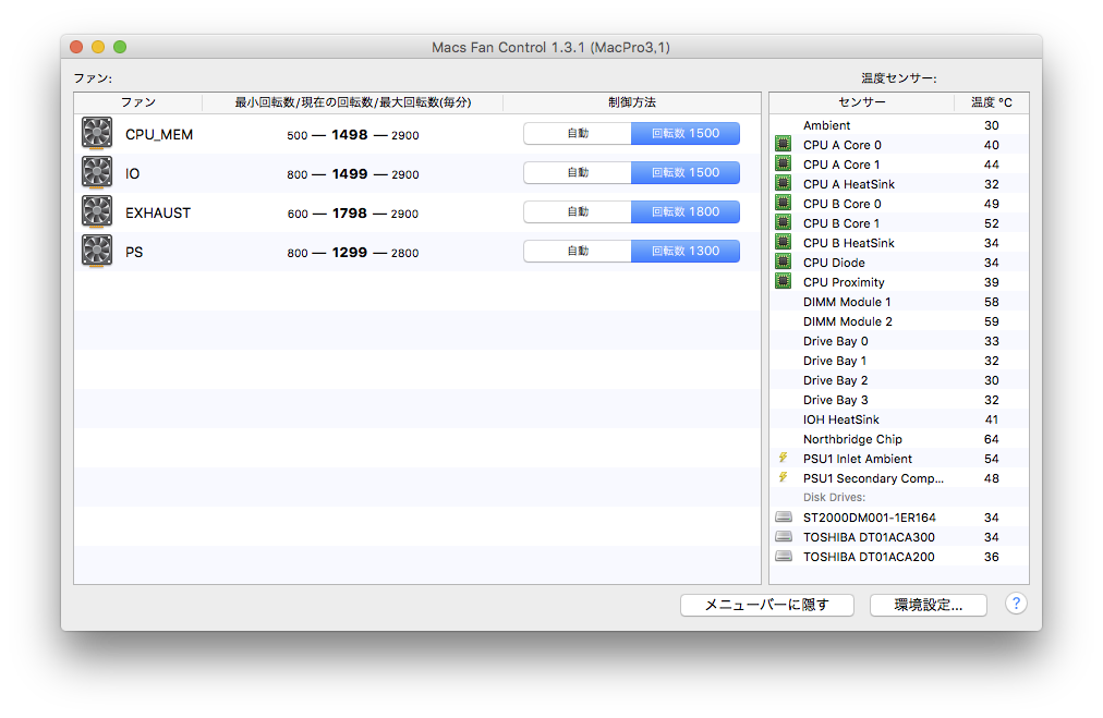 Mac Pro (2008) には4箇所にファンが内蔵されていて、それぞれの回転数を設定することができる。
